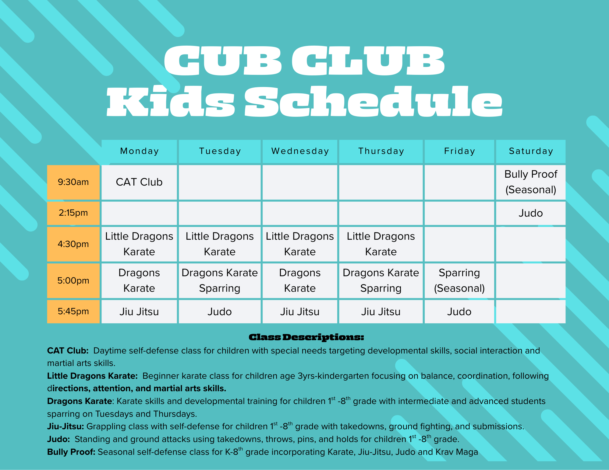 We offer kids karate, jiu-jitsu and judo for ages 3-12 with a focus on developmentally appropriate and engaging skill building, games, and self-defense training.